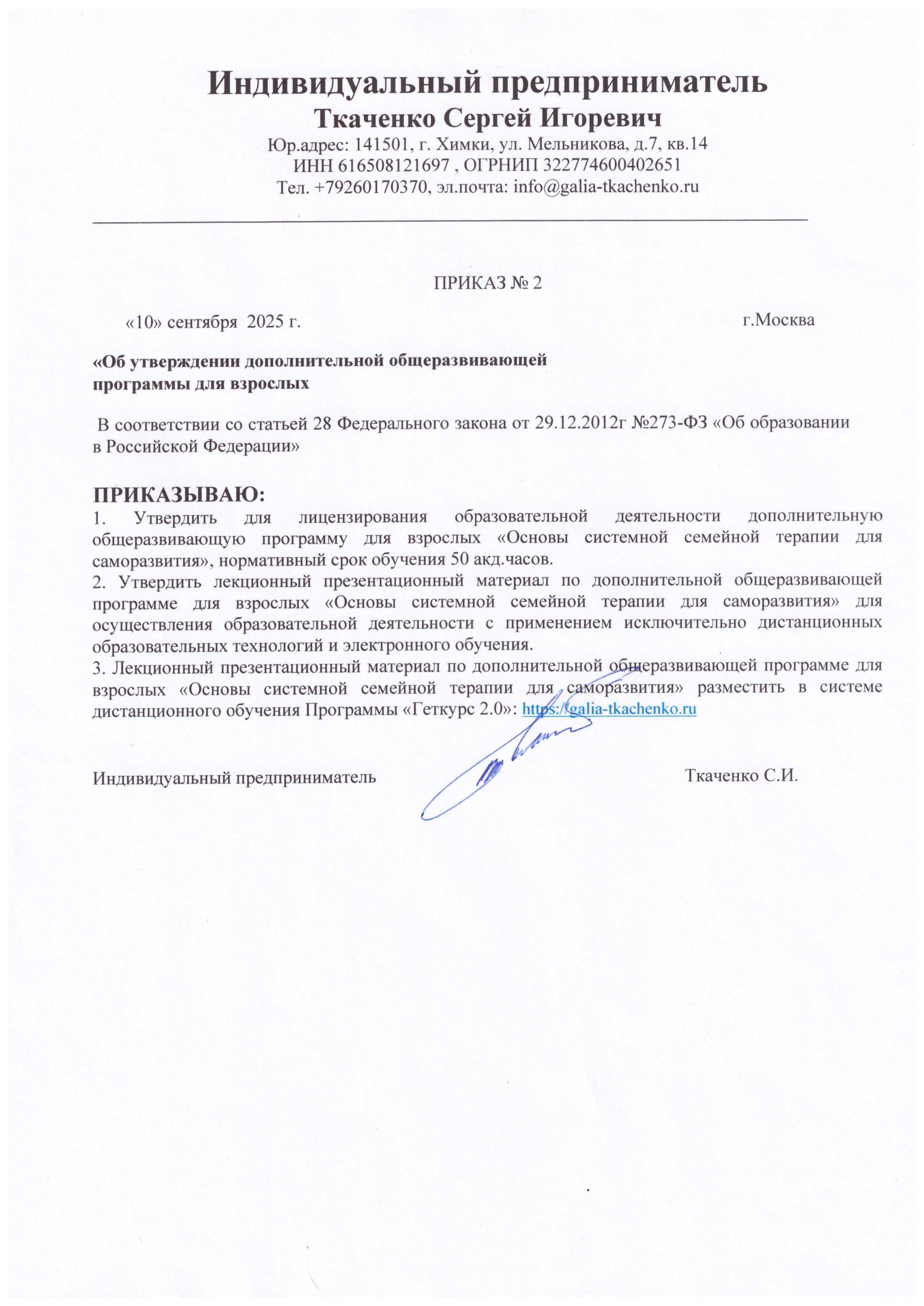 - Приказ №2 об утверждении программы